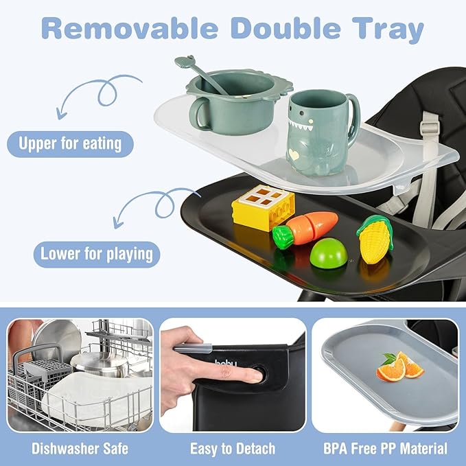 - Removable Double Tray: This infant feeding chair is equipped with a double tray that can be easy to detach according to your needs. The upper tray is suitable for eating and feeding, and the lower tray is ideal for playing. The tray is made of BPA free PP material and harmless to the health of your baby.