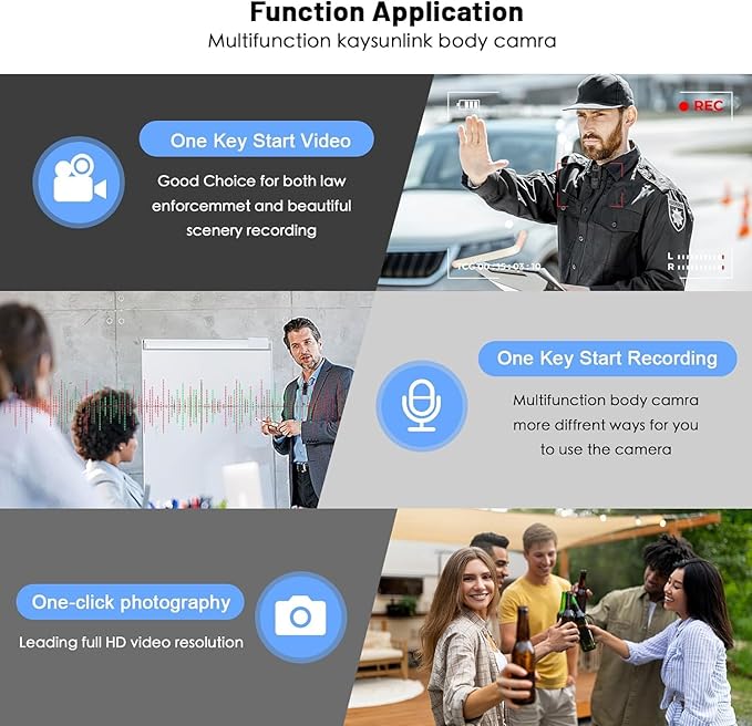 - 【Multifunctional Application】Kaysunlink Mini Body Camera is lightweight & compact,It can be used almost anywhere, Climbing, skiing, cycling, hiking, surfing. It's portable that can either be clipped on your backpack or put in your pocket. Perfect for Hiking, Driving Record, Meeting Record,Outdoor sports.