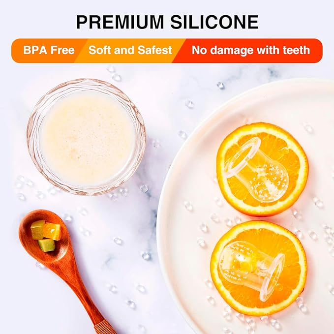 - 【SAFE SILICONE POUCH HOLES】HAOBAOBEI fruit feeder is made from 100% food grade silicone. BPA free. Lead, phthalates, latex free. 2mm silicone pouch hole, the juice is even and not easy to be blocked. When the baby bite the feeder pacifier, the food enters the baby's mouth in the form of fine and digestible drops, which will not choke the baby and avoid the risk of suffocation.