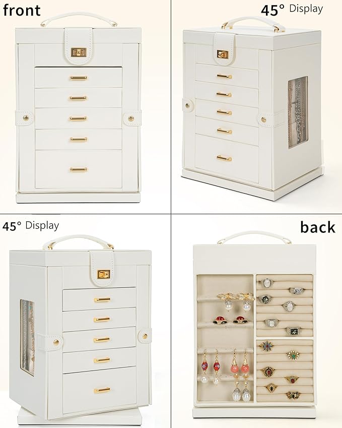 - 【360°Rotating & Elegant】Attractive appearance with leather surface and soft velvet lining. Sturdy construction and quality material make it very durable.Plus 360° rotation function,The jewelry holder can tidy your table and protect your precious jewelry for a very long time .