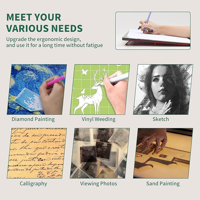 - <𝗕𝘂𝗶𝗹𝘁-𝗶𝗻 𝗧𝗶𝗹𝘁 𝗦𝘁𝗮𝗻𝗱 𝗗𝗲𝘀𝗶𝗴𝗻>: The built-in stand of the art light pad is designed for convenience and versatility. The stand features an adjustable tilt function, allowing you to customize the angle of the drawing surface according to your preference for comfortable drawing sessions. Its design ensures stability at various angles while maintaining the light and portable nature of the Light Pad.