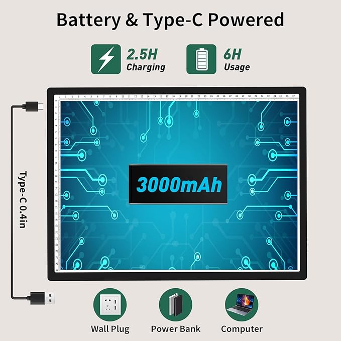 - <𝗕𝗮𝘁𝘁𝗲𝗿𝘆 𝗣𝗼𝘄𝗲𝗿𝗲𝗱 𝗗𝗲𝘀𝗶𝗴𝗻>: The cordless light drawing pad boasts a rechargeable battery, delivering up to 4 hours of uninterrupted usage with just a single 2.5-hour charge. This functionality elevates the light pad's mobility, empowering users to engage in work or creativity even in settings devoid of power sources. Its portability renders it perfect for outdoor sketching or scenarios where power outlets are scarce. The absence of cords translates to reduced clutter and heightened convenience in your workspace.
