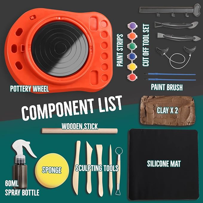 - 🏺8 DIFFERENT SCULPTING TOOL HEADS - The complete pottery kit comes with everything kids need to get started easily, including Pottery wheel, Clays, Cut off tool set, Sculpting tools, Wooden sticks, Paint colors, Sponge, Spray bottle and a Silicon mat.