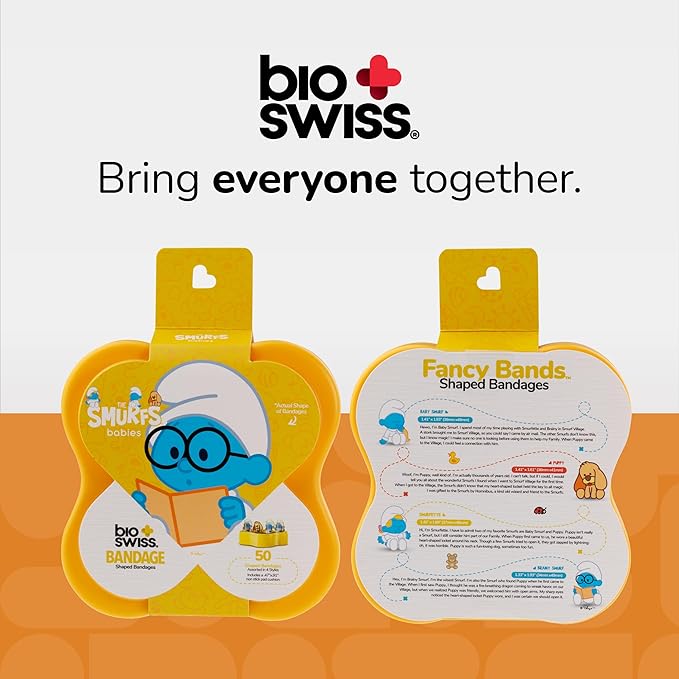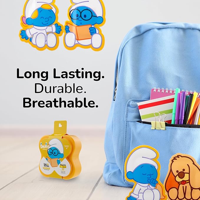 BioSwiss Bandages, The Smurfs Baby Smurf Shaped Self Adhesive Bandage, Latex Free Sterile Wound Care, Fun First Aid Kit Supplies for Kids and Adults, 50 Count Case