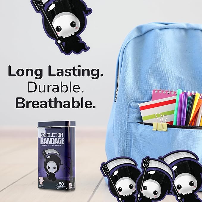- SKELETON HALLOWEEN BANDAGES: This 50 piece tin of frightfully fun Halloween Skeleton bandages is great for putting a smile on kids' faces while protecting wounds such as cuts, scrapes, and burns; sticky bandages are perfect for kids and adults alike, and also for school nurses and pediatric doctors