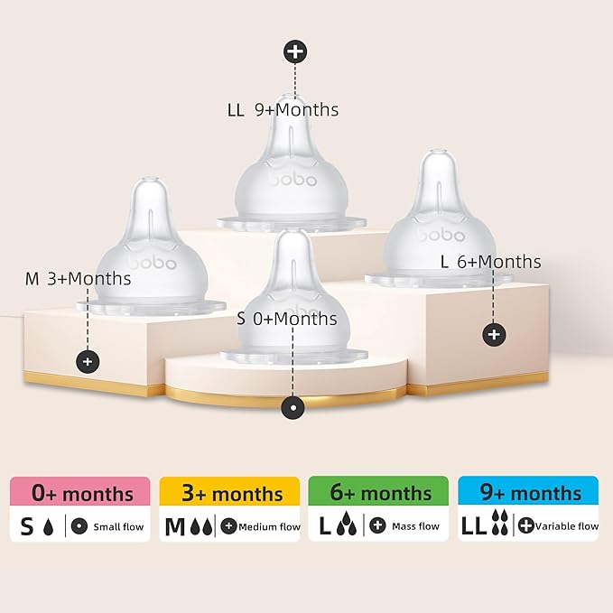 - 100ML/3.4OZ with S nipple for 0-3 months +, 160ML/5.4OZ with S nipple for 3-6 months +, 260ML/8.8OZ with M nipple for 6-12 months +. Meet the needs of all stages of the baby.
