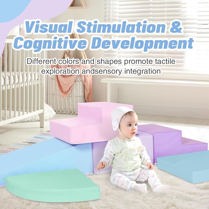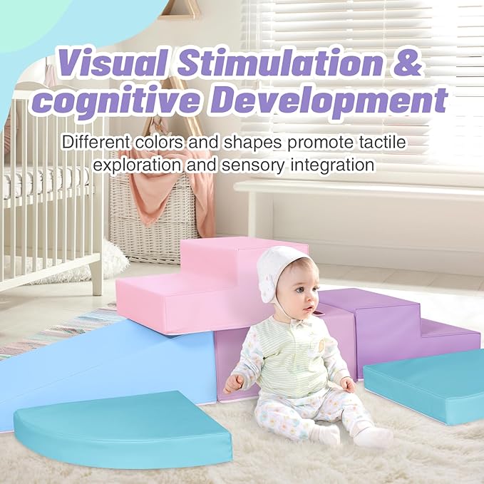 - 6-Piece Set: Baby climbing blocks consists of 1 pink stair, 1 lilac purple stair, 2 azure blue half-moon, 1 purple square and 1blue slide. This soft play equipment stimulates your child's imagination to create endless combinations of structures, allowing them to enjoy the fun of the toy as they climb up and down, stacking and swapping four different shapes. Our climbing sets have a unique patented design that your child is sure to love