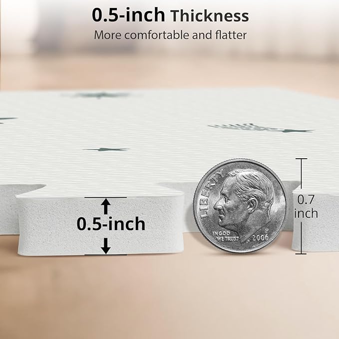 - MAXIMUM SAFETY: The 0.5" thick foam flooring tiles create a safe play area for little ones. Made from certified EVA foam through a batch process, The floor pads for babies ensure premium quality and are free from BPA, PVC, and other harmful substances.