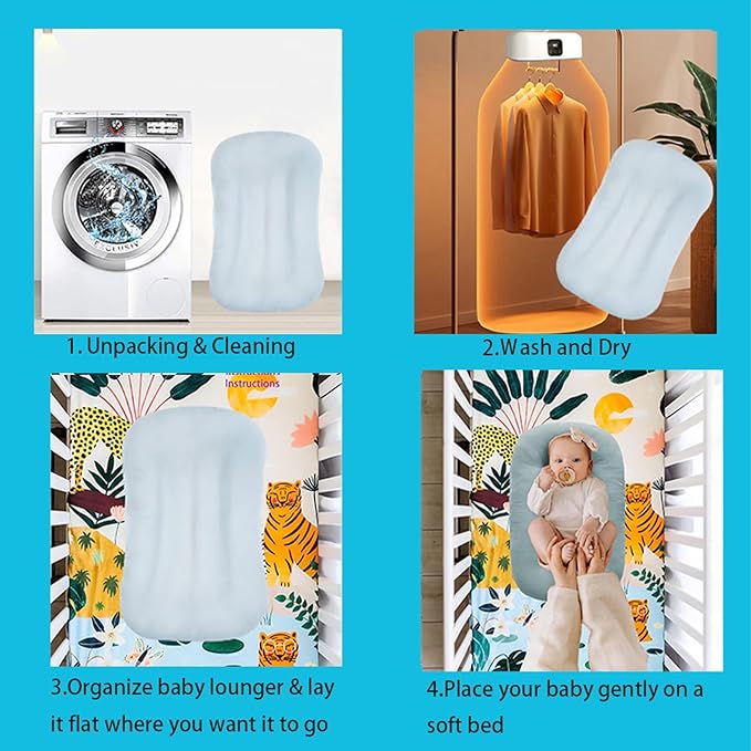 - Protective Guardrail Design: The baby lounger features raised guardrails, to provide gentle support and prevent rolling during play or rest. Ideal for placement on flat, firm surfaces like beds, cribs, or changing tables (always ensure the surface is stable and supervised).