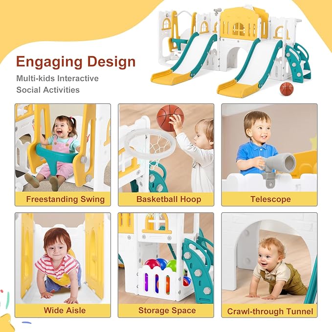 - 【10-in-1 Multifunctional Playset】JOYLDIAS 10 in 1 toddler slide set has 10 activity areas, including double 2 slides, basketball hoop, storage space and non-slip enclosed step, widened climbing ladder, crawl-through tunnel and telescope. It can exercise children's muscle strength, balance and coordination and make the reaction more agile. And add baby's fun during the play.