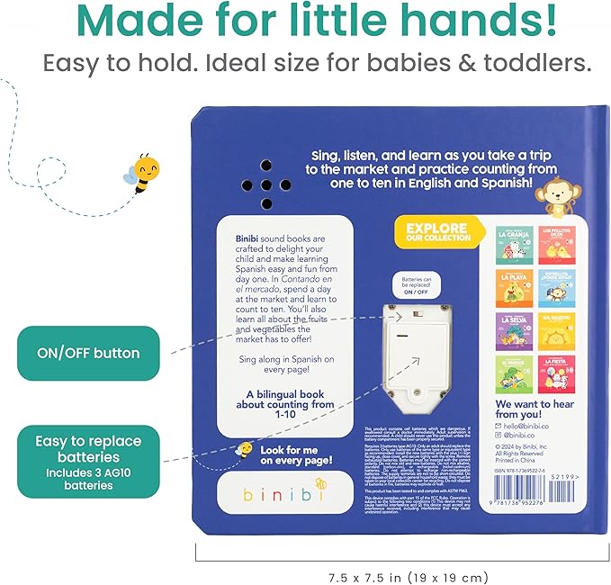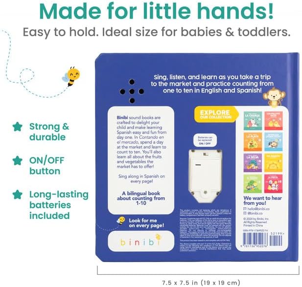 - 𝗗𝘂𝗿𝗮𝗯𝗹𝗲 & 𝗠𝗮𝗱𝗲 𝗙𝗼𝗿 𝗟𝗶𝘁𝘁𝗹𝗲 𝗛𝗮𝗻𝗱𝘀. Binibi bilingual English-Spanish books for babies & toddlers 1-3 are durable and feature hard covers, thick pages and rounded corners - they are made for little hands and are easy to clean! All Spanish musical sound books feature an on/off button for extended battery life, and easily replaceable batteries. 3 AG10 batteries in every book.