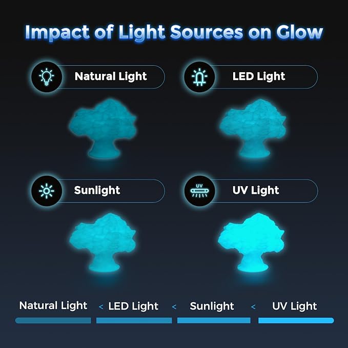 - Exceptional Glow Effect - This glow-in-the-dark PLA absorbs light and emits a soft glow in the dark. The brightness lasts for up to 5-100 minutes, with a 310% enhancement in brightness compared to standard glow-in-the-dark materials, providing a brighter and longer-lasting glow.