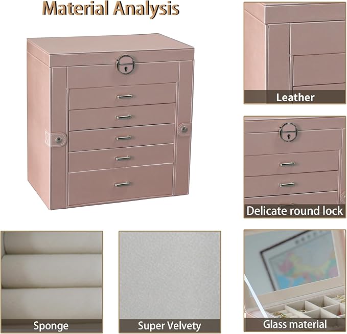BOOVO Jewelry Box For women, 6 Layer Large Jewelry Organizer With Mirror, Multi-Function Storage Box With Lock, Accessory Holder With 5 Drawers, For Earrings Necklace Ring Bracelet (Rose Gold)