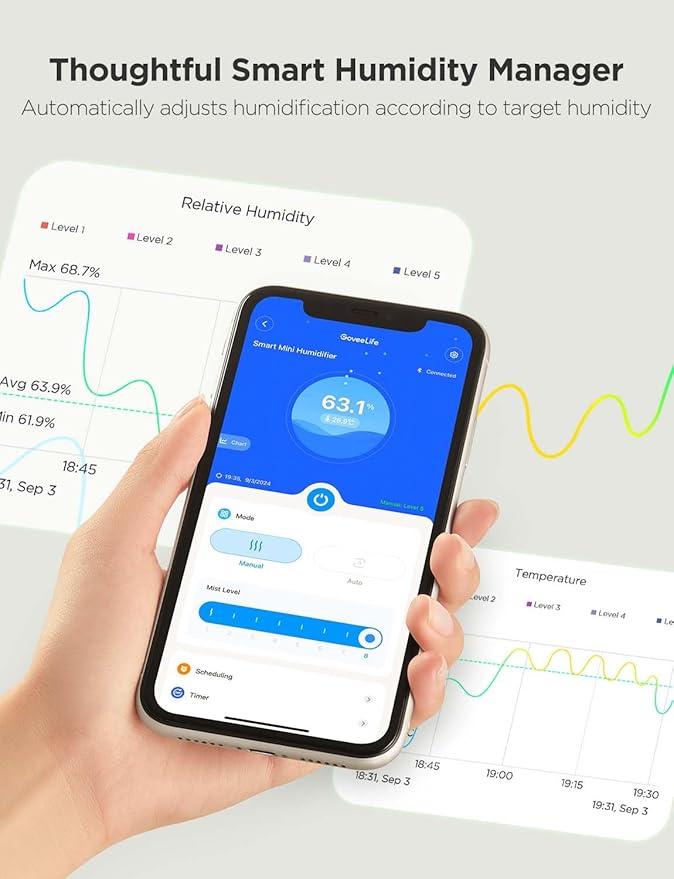 - Intelligent Humidity Control: Say goodbye to complicated adjustment. With auto mode, simply set your ideal humidity from 30% to 80%, and the built-in sensor will continuously monitor and adjust humidity levels (±3% tolerance) no need thermometer hygrometer, making it ideal for kids room, plants, nursery and bedroom.