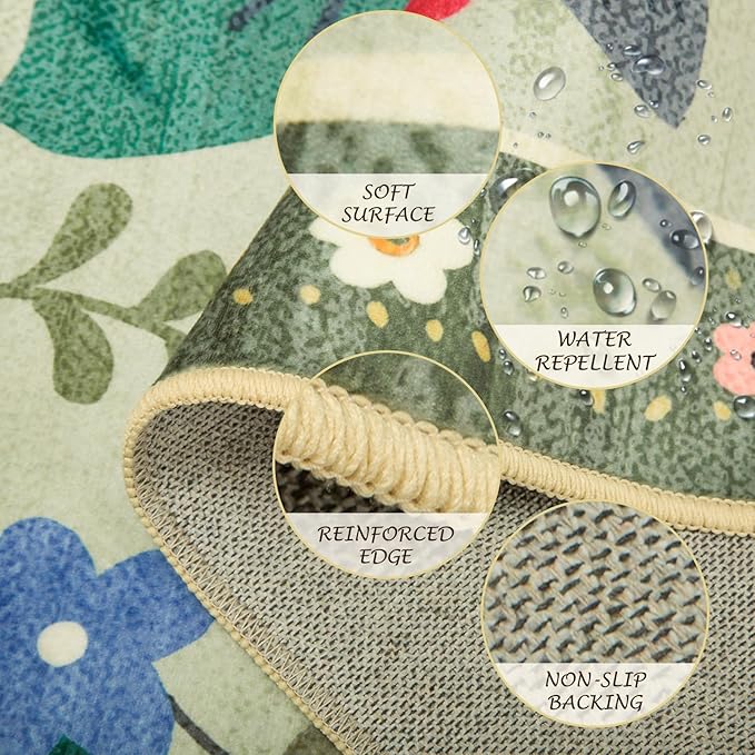 Floral 6x9 Area Rug Machine Washable Soft Print Boho Carpet Non Slip Doormat Low Pile Flower Area Rugs for Living Room Bedroom Nursery Kitchen Dining Room Indoor-Light Green