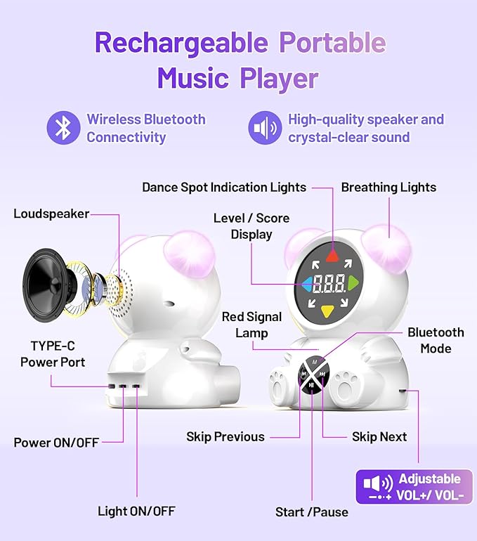 - 🎵 Easy Bluetooth and High-Quality Sound: This dance mat features instant wireless pairing, connecting to phones, tablets, or laptops within seconds. Bring your favorite tracks to life and host lively dance parties. 52mm premium speakers deliver crystal-clear audio, doubling as a fun portable boombox with easy volume control. The cute bear design with flashing ears keeps kids entertained!