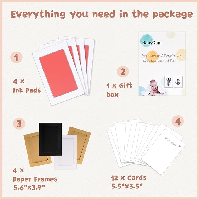 • 【Product Details】: Our baby hand and footprint kit measures 5.0"x3.2" with an ink window of 3.7"x2.3", which is the best size for recording hand and footprints of newborns 0-6 months old or pet paw prints . The ink pad for baby hand and footprints includes 4 clean touch ink pads, 12 stamping cards, and 3 display frames, ensuring you have ample opportunity to capture the best stamp.