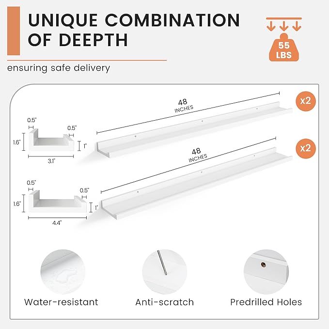 • 【Easy to Install】FLYJOE picture ledge shelves are quick and easy to install! Each set comes with pre-drilled holes and all necessary hardware, including a mini level for perfect alignment. With simple instructions, you can have your shelves up in minutes, allowing you to start decorating right away