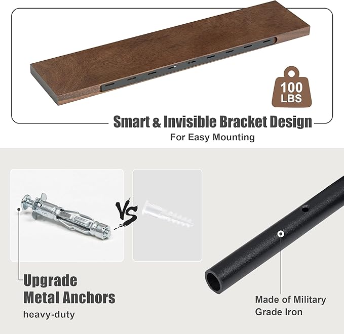 - STURDY & FUNCTIONAL: Not only does the floating shelf showcase the natural grain pattern of the wood, but with unique heavy-duty metal mounting brackets, our floating shelf can hold up to 100 lbs per shelf. The shelves have a flat surface and stable construction, so they are suitable for any room in your home.
