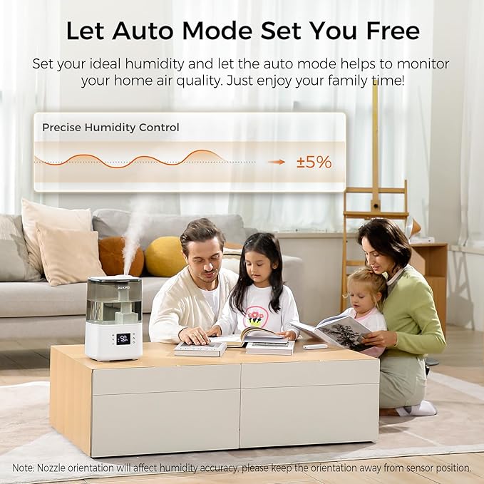 - 𝑻𝒂𝒊𝒍𝒐𝒓𝒆𝒅 𝑪𝒐𝒎𝒇𝒐𝒓𝒕, 𝑯𝒆𝒂𝒍𝒕𝒉𝒚 𝑳𝒊𝒇𝒆: Experience effortless relaxation with smart sensor that automatically monitor and adjust humidity level to your ideal setting from 45% to 60% RH. Just set the humidifier for your family and plants, let auto mode do the rest