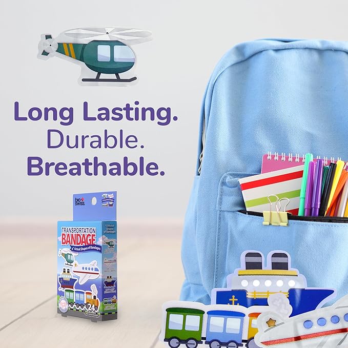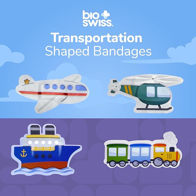 - TRANSPORTATION BANDAGES: This 24 piece pack of Transportation bandages feature boat, train, airplane, and helicopter shapes, and is great for putting a smile on kids' faces while protecting wounds such as cuts, scrapes, and burns; sticky bandages come in a cute cardboard box and are perfect for kids and adults alike, and also for school nurses and pediatric doctors