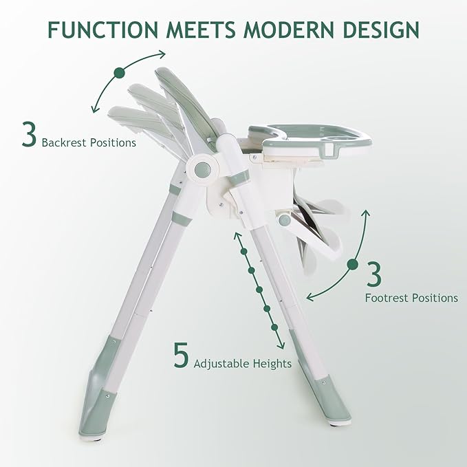 - Adjustable High Chair: The high chair offers a versatile and convenient solution for your growing child, it has 5 adjustable heights, 3 positions for the back rest and 3 options for the foot rest to ensure optimal comfort for your little one during mealtime