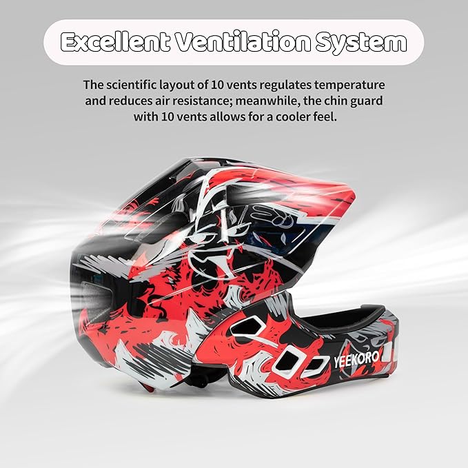 - FULL FACE PROTECTION SYSTEM: YEEKORO children's full face bike helmet is a unique blend of hard ABS shell and advanced EPS crash-proof material, with well-designed chin protection, which together builds a multiple defense system. Whether riding off-road or on the highway, your child will be provided with comprehensive safety protection, effectively resisting injuries caused by strong impacts and guarding every moment of adventure.