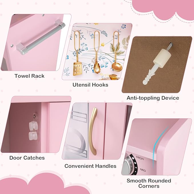 - 【ASTM & CPSIA Certified & Child Secure Design】Made of solid MDF material, this toy kitchen sets is stable and sturdy for long service life. What’s more, the equipped anti-toppling device attaches the kids play kitchen to the wall tightly, avoiding accidental falling.