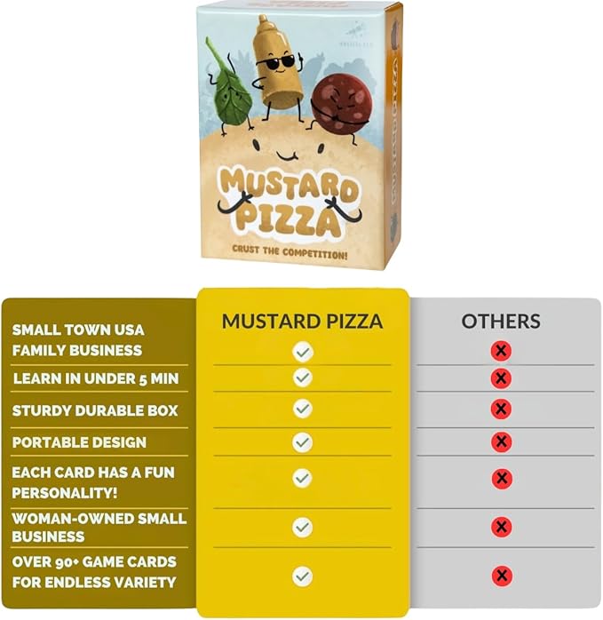 - PIZZA MAYHEM AWAITS! - Mustard Pizza is a fast-paced family card game where players race to craft the ultimate pizza with a mix of ingredients and action-packed twists! Compete to build the ultimate pie with wild toppings and unexpected twists in every turn!