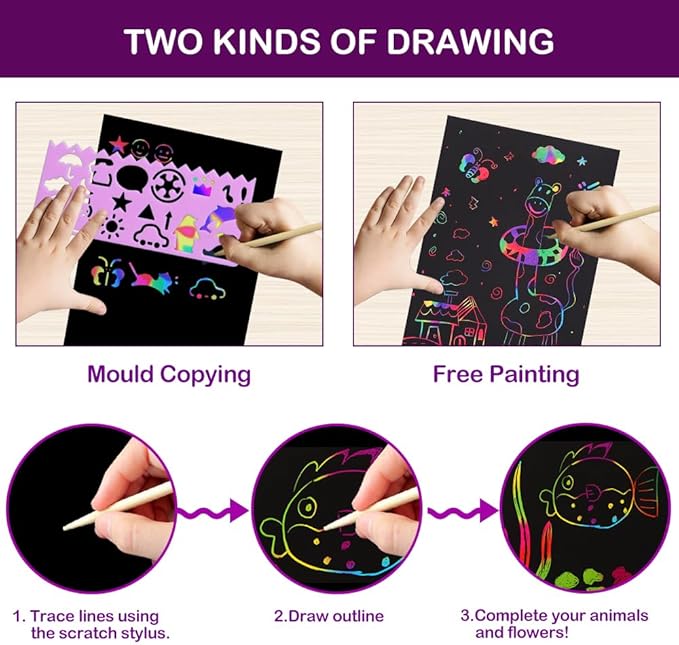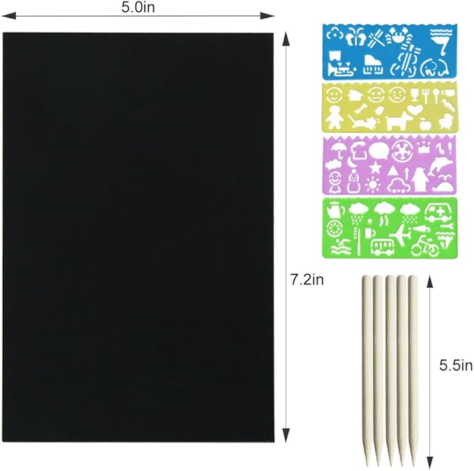 - SCRATCH RAINBOW ARTS KIT INCLUDED: 50 Pcs scratch paper, 50 Pcs wooden stylus, 4 Pcs drawing stencils. Many accessories in our scratch paper art can make children enjoy themselves. They can use the stencils for design more cute and colorful shapes,which will give them hours of fun and creativity