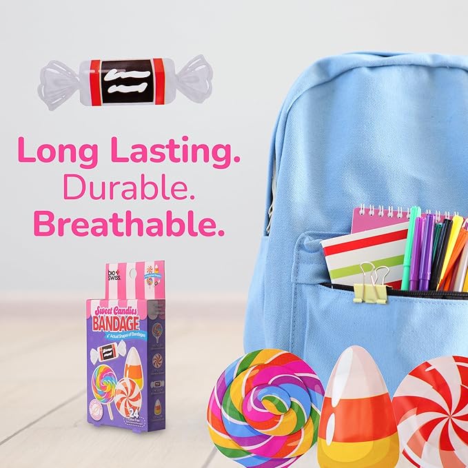 - EASY TO CARRY AND USE: These cute and colorful Sweet Candies children's bandages are easy to take with you for travel, and easy to store in a home first aid kit; these healing bandages are perfect for school, summer camp, camping trips, weekend getaways and more