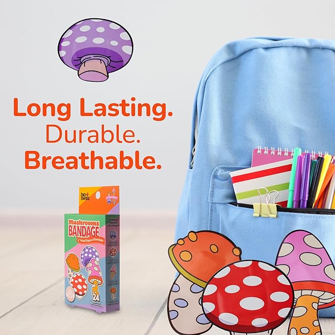 - EASY TO CARRY AND USE: These cute and colorful Mushroom children's bandages are easy to take with you for travel, and easy to store in a home first aid kit; these healing bandages are perfect for school, summer camp, camping trips, weekend getaways and more