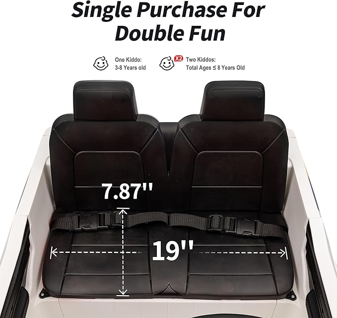 - 19" DUAL SEATER : This battery powered police kids car has ample seater, allowing two children to ride together comfortably under 110lbs. Adjustable seat belts and double-locking door design also ensure kid's safety.