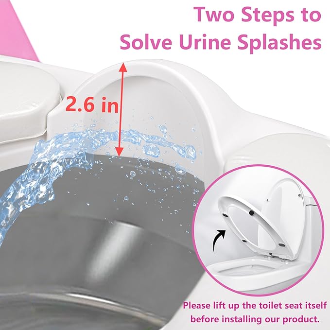 - Splash-proof and Easy to Clean: Lift up the adult toilet seat and place baby toilet seat on the toilet bowl, along with the splash guard that is up to 2.6” deep to solve the urine splash problem. The removable upholstery can also be easily removed for cleaning for regular care
