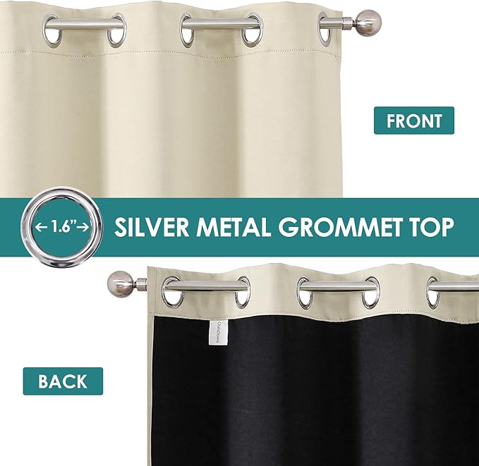 - SET DETAILS: Set of 2 total blackout curtain panels per package. Each lined curtain measures 52 inch wide by 54 inch long with 8 silver metal grommets (1.6 inch inner diameter) on top, easy to install and slide.