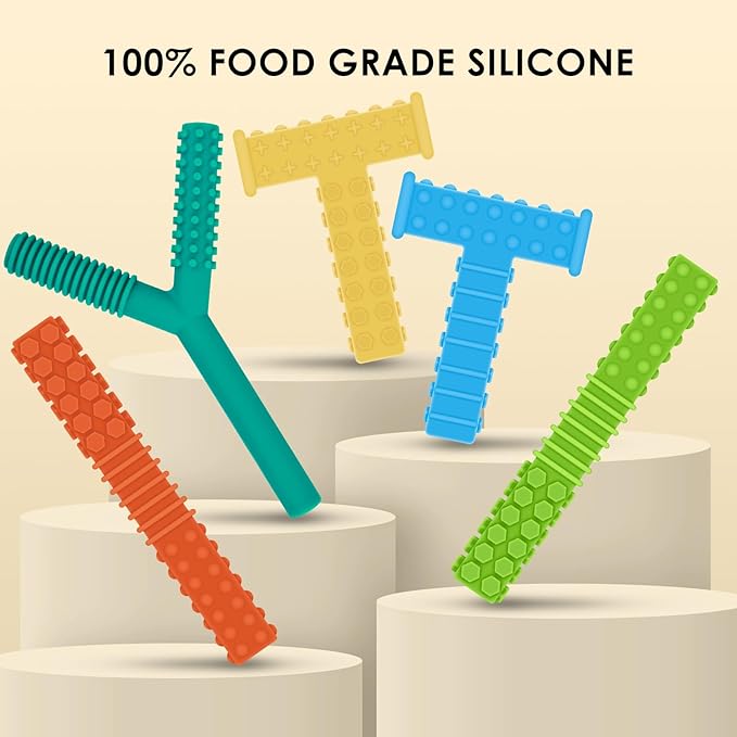 - FUN TEETHING TOYS: Our sensory teething toys set includes 2 pcs T shaped, 1 pcs Y shaped sensory chewy toys and 2 pcs teething tubes, helps keep your kids from chewing on fingers, pencils, hands, clothes, hairs, etc. Reducing stress, anxiety especially when they need to soothe, calm, or focus
