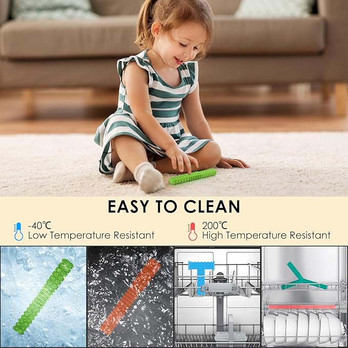 - EASY TO CLEAN: very easy to clean, just wash the sensory chewing toys with soapy water, or wash it with dishwasher. Our teethers for babies can be sterilized by boiling water, steam sterilizer and sunlight. -40℃ to 200℃ Temperature resistant, we suggest cleaning it before first use and after each use