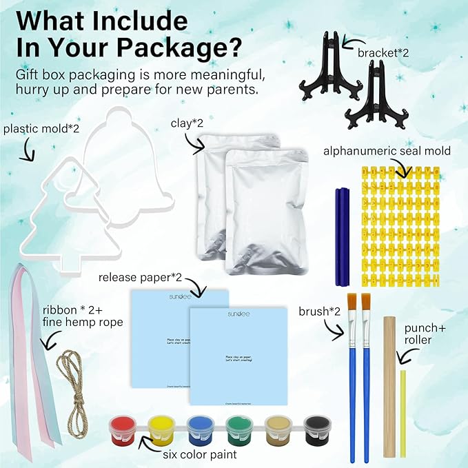 - The Most Complete Kit:Everything you need to make beautiful, lasting handprints, footprints or paw prints souvenir ornaments to display on your mantel or hang on your Christmas tree. Includes air-dried clay, roller, straw, 2 paintbrushes, 2 ribbons, bonus custom template kit, 2 display stands, 6 colors of paint, simple instruction manual.