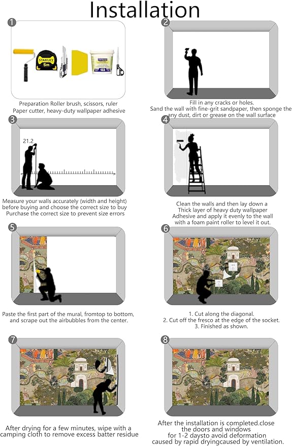 - Installation Steps1. Fill in any cracks or holes and clean the surface of the wall of dust, dirt and grease.2. Apply heavy-duty wallpaper paste to the wall, not the mural.3. Mark the position of each strip of wallpaper with a spirit level.4. Align the pattern and slide it into place.5. Scrape the bubbles with a spatula.6. Let it dry for a couple of minutes and it's ready to go!
