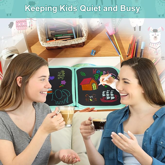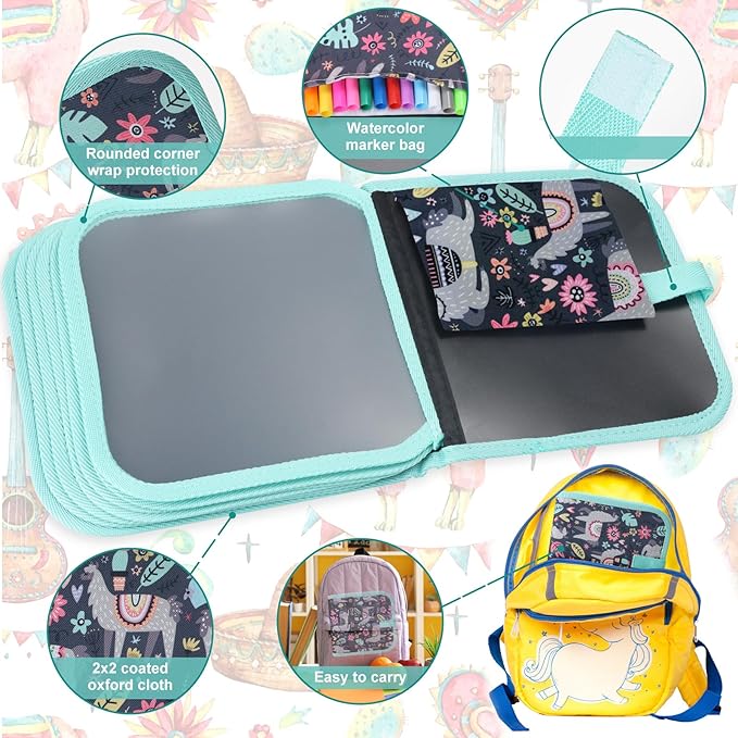 - 🎨Kid's Road Trip Essentials--Kids Erasable Graffiti Book has sticky buttons on the outside to keep it in place and a pens pocket on the inside for 12 watercolor pens. Even in cars, planes and other means of transportation, kids can draw as much as they want.
