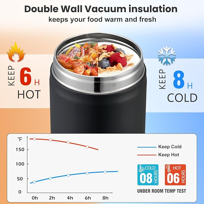 - Thermo for Hot&Cold Food: Our soup thermo is made of double-walled 304 stainless steel with vacuum technology and will keep your child's meal warm or cool for over 5 hours. Its sturdy construction and attractive design make it an ideal insulated lunch box for children and adults alike, ensuring that every meal is enjoyed to the fullest.
