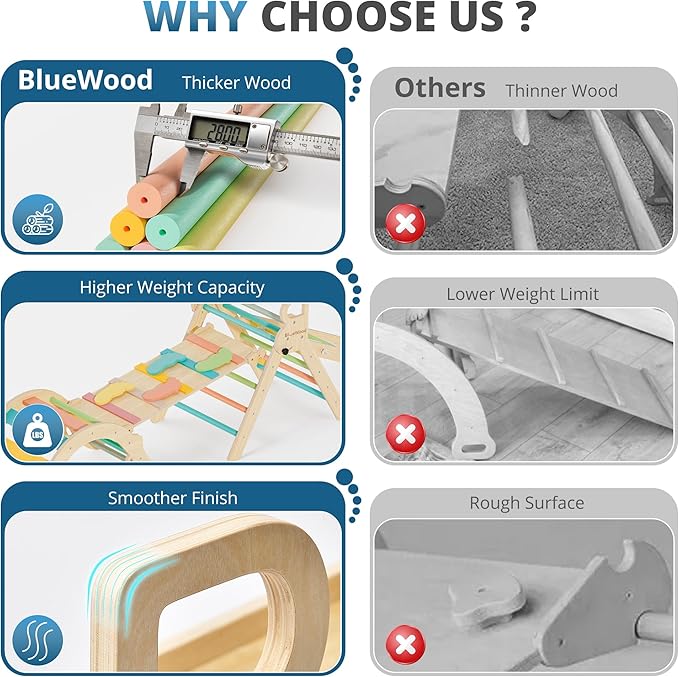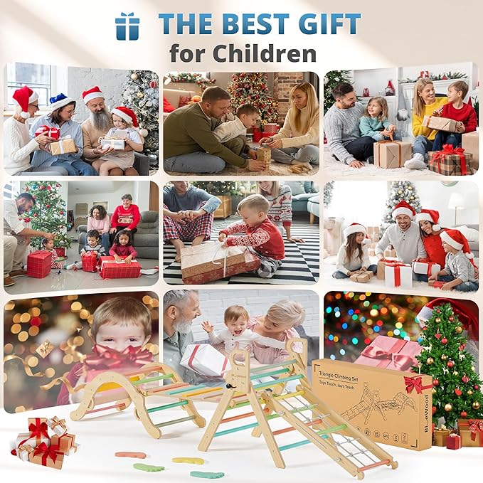 BlueWood 10-in-1 Pikler Triangle Set, Toddler Climbing Toys Indoor, Montessori Climber, Baby Jungle Gyms with Arch, Extra Rope Ladder & Footprint Balance Beam - Rose Garden