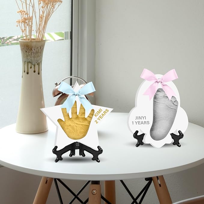 - Set Includes:Two pieces of air dried clay, roller, straw, 2 paint brushes, 2 ribbons, additional custom template kit, 2 display stands, 2 colors of paint.Grey and gold.Everything you need to make beautiful, lasting footprints or paw prints souvenir ornaments to display on your mantel or hang on your Christmas tree.