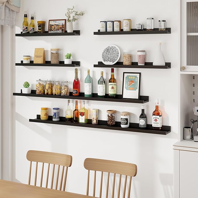 - Picture Wall Collage Decor: Do you have a lot of memorable photos, but don't know how to display them, our wood floating shelves are perfect for you! We offer 6 shelves, you can mix and match colors, height, length, and symmetry. With our long wall shelf set, your dull space will be transformed into wall art