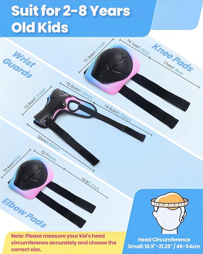 - 7PCS Kids Helmet and Protective Gear Set - Includes 1 adjustable helmet, 2 knee pads, 2 elbow pads, and 2 wrist guards—everything your child needs for safe riding. Built with a tough, scratch-resistant PP shell and cushioned interiors for long-lasting protection and comfort.