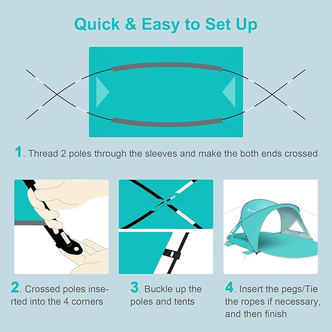 - Stable and Durable Construction: Equipped with sturdy 8.5mm thickened poles, 4 sandbags (2 on each side), 8 stakes (including 4 ground stakes and 4 plastic stakes), and 4 wind ropes, the tent can withstand 3-4 level wind forces to remain stable and secure, ensuring reliable windproof performance for your beach adventures