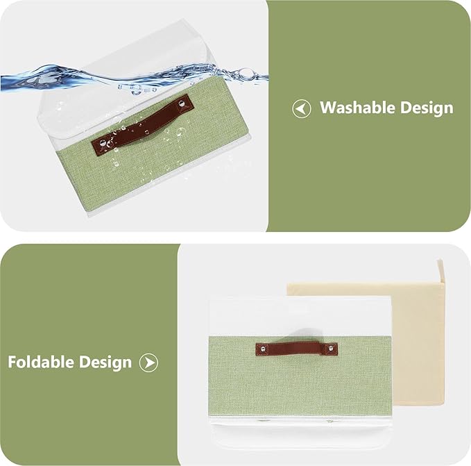 ANMINY 4PCS Storage Boxes with Lid Washable Decorative Storage Bins Basket with PU Leather Handle Foldable Linen Fabric Storage Cubes Containers for Home Closet Organizer - Green White, Large Size
