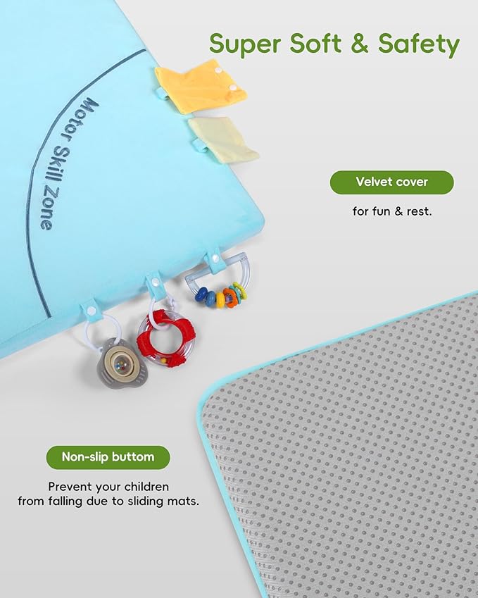 - Soft & Safe Play Area: Create a snug haven for your little one to play, grow & explore in absolute comfort! Our play mat adopts non-toxic and odorless materials with soft velvet cover, which is is easily machine washable and tumble dryer safe so it stays fresh through countless messes. The back of the crawling mat features a non-slip design to ensure the mat stays securely in place. This allows your baby to play and grow in a completely safe and comfortable environment.
