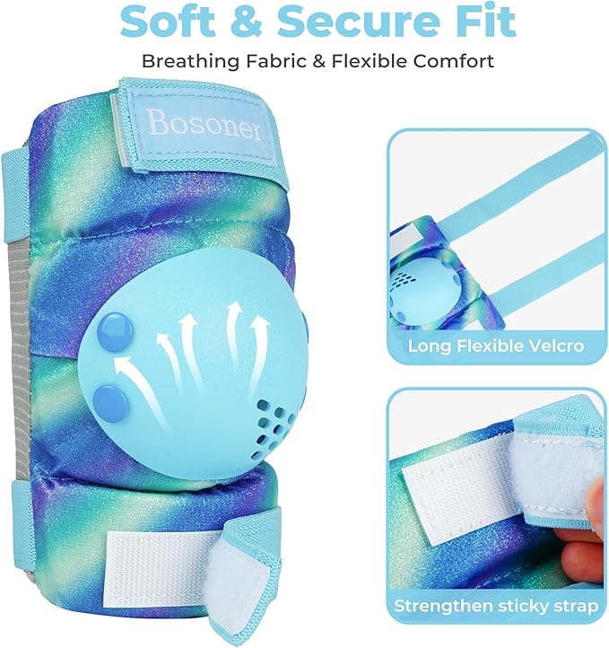 - Flexible Elastic Adjustment - BOSONER skate pads kids and wrist guards adopt upgrade Adjustable elastic straps and Velcro closures to securely fit your knee and elbow