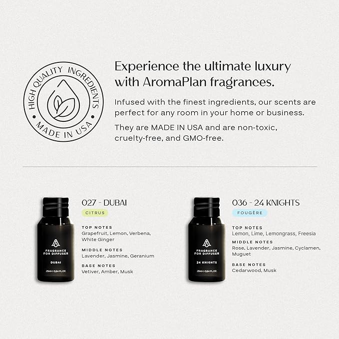 - LUXURIOUS WATERLESS PLUG-IN DIFFUSER WITH 2 FRAGRANCES – The AromaPlan Authentic 2025 Upgraded Plug-In Diffuser uses advanced NT10x nanotechnology to transform liquid fragrance into dry, vaporous microparticles, evenly scenting spaces up to 500 sq ft without water or oily residue. This set includes 2 bestselling 25ml fragrances—Dubai & 24 Knights—delivering fresh, invigorating scents.